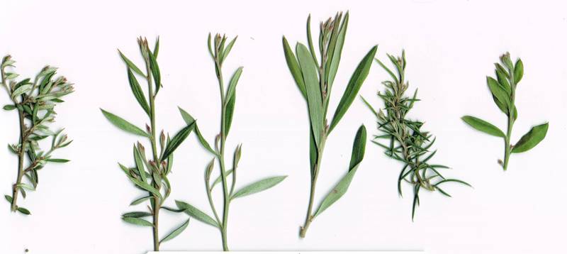 The pictures below show the leaf form of (from left to right) the prostrate form, spreading form 1, spreading form 2, upright large-flowered form, upright fine-leaved form, and the Hollybank form. The grey line at the bottom is the length of a push in tag for scale. Below that are shots of the upright fine-leaved form (left) and upright large-flowered form (right).